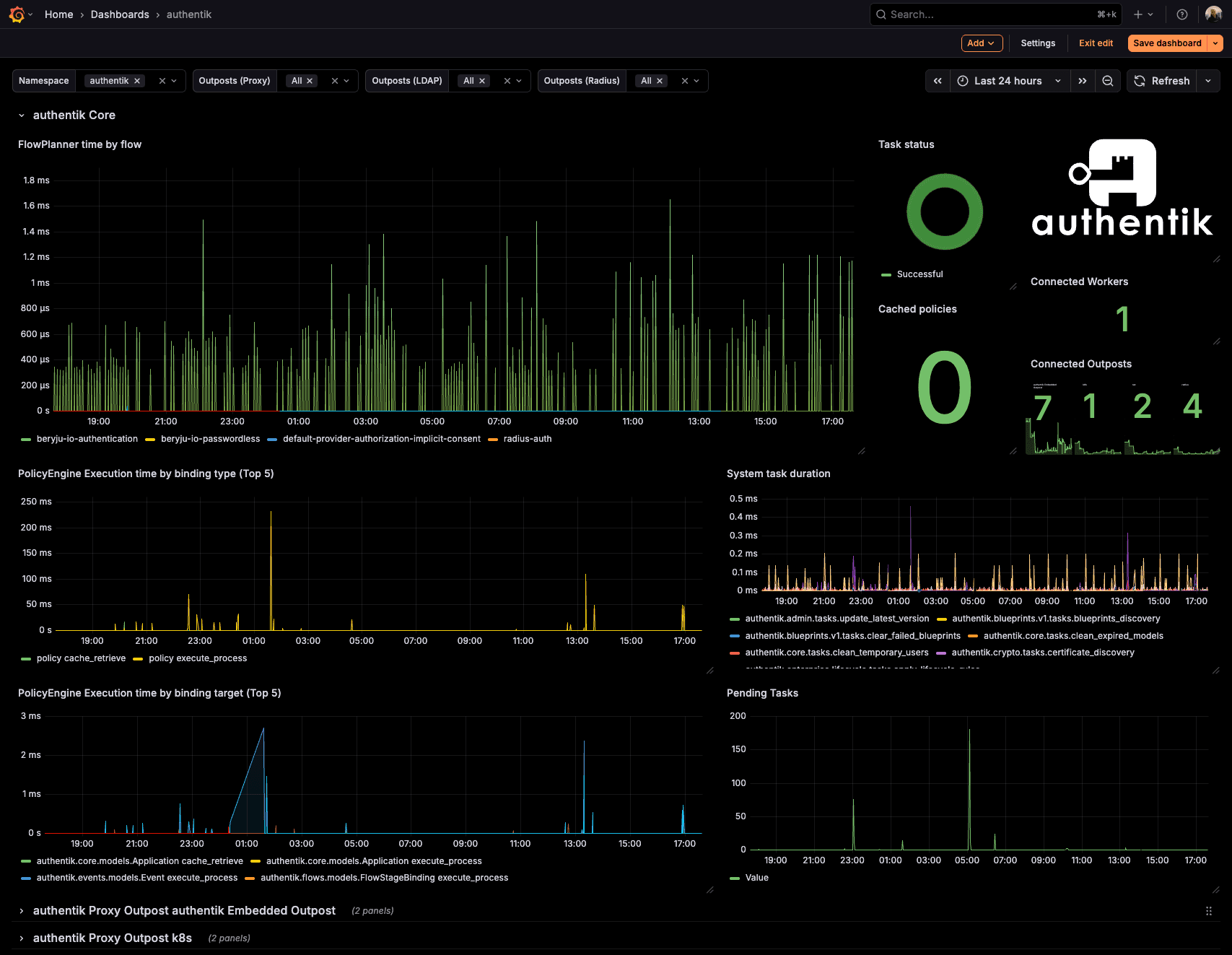 Both the core authentik server, worker and any outposts expose Prometheus metrics on a separate port (9300), which can be scraped to gather further insight into authentik's state. The metrics require no authentication, as they are hosted on a separate, non-exposed port by default.