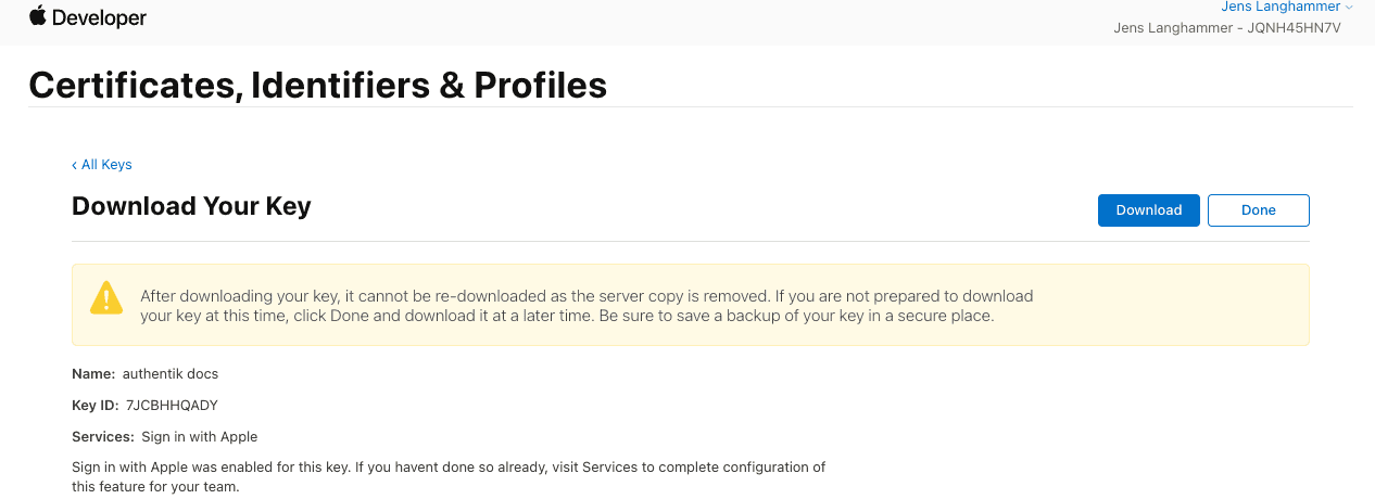 To integrate Apple with authentik, you will need to register two identifiers and a key in the Apple Developer Portal.